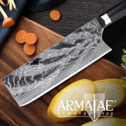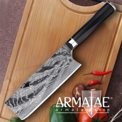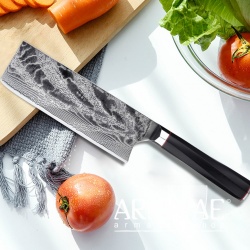 Der 67-lagige Damaszenerstahl verdankt seine auffallend schöne Zeichnung der besonderen Schmiedearbeit. Die Klingen besitzen eine zentrale Schneidlage und links und rechts je 33-lagigen Damaszenerstahl, welcher vor dem Schmieden zusätzlich tordiert (gedreht) wird. Erst nach diesen Vorarbeiten werden die Stahlteile miteinander verschmiedet. Damaszenerstahl mit Lagen in gerader Zahl, wie z.B. 66 oder 68 Lagen ist für Messer ungeeignet, da man an der Schneide immer 2 Lagen Stahl hätte. Damaszenerstahl mit geraden Zahlen wird daher auch Deko-Damast-Stahl genannt.