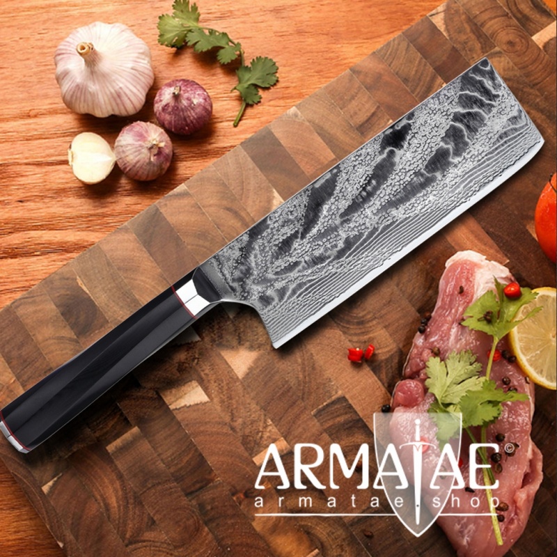 Diese japanischen High-End-Küchenmesser mit Klingen aus 67 Lagen rostfreiem Messerstahl gleiten mit ihrer rasiermesserscharfen Klinge mühelos durch jedes Schneidgut.