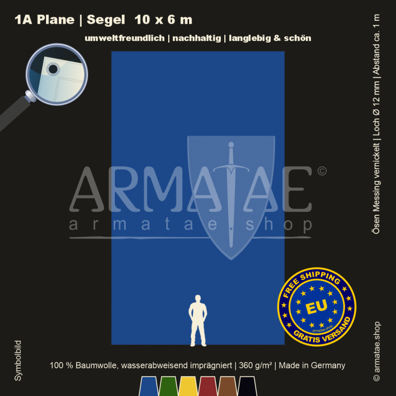 Schwere Sonnenschutz & Regenschutz Plane aus wasserabweisend imprägniertem 100 % Baumwollgewebe mit 360g/m². Für unzählige Einsatzbereiche, ob mobil oder für den Dauereinsatz fest montiert. Umlaufend gesäumt und mit rostfreien Ösen aus vernickeltem Messing mit einem Innendurchmesser von 12 mm im Abstand von 1 m von Hand gefertigt. 5 Jahre Garantie auf die äußerst robuste Verarbeitung.
