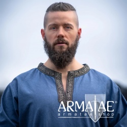 Sehr schöne Tunika mit kurzen Ärmeln und Bordüren am Dekolleté und den Ärmeln. Die Farbe Blau war wohl die beliebteste und weit verbreitetste Farbe bei den Wikingern. Mit den schönen, farblich abgestimmten Bordüren in Blau und Gold gehalten präsentiert sich diese Tunika sehr authentisch und gehört in jede Garderobe eines jeden Wikingers.