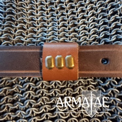 Zum Anbringen einfach mit einem 2 mm Einfach-Schnürmeißel Schlitze stechen, die Nieten durchführen und auf der Rückseite umbiegen und eventuell mit Gefühl in das Leder etwas einklopfen.