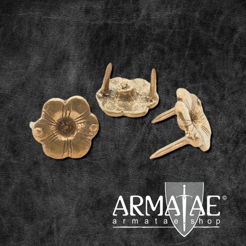 Authentischer mittelalterlicher und schöner Zierbeschlag aus Messing mit rückseitig 2 Pins zur Befestigung an Ledergürtel, Taschen, etc. Die Niete passt auf Gürtel ab 20 mm Breite.