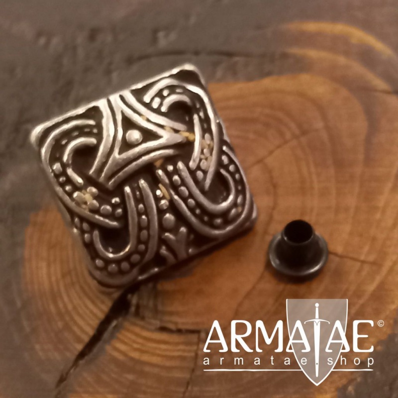 Diese schön gearbeitete Replik einer kleinen Wikingerzierniete mit Knotenmotiv im Borrestil eignet sich perfekt, um historische Wikinger-Gürtel im Larp und Wikinger-Reenactment zu beschlagen oder um Alltagsgegenstände wie Schuhe, Taschen o. ä. zu zieren.