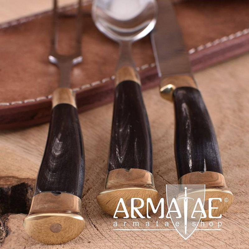 Ein klassisches 3-teiliges Besteckset im Stil des Mittelalters bestehend aus einem Messer, einer authentischen 2-zinkigen Gabel, einem großen Löffel sowie einem robust genähtem Etui aus echtem Leder.