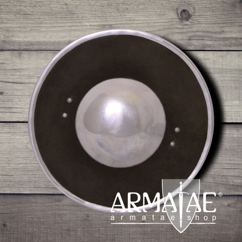 Kleiner massiver, schaukampftauglicher Buckler aus 2 mm Stahl gefertigt, mit zusätzlichem Lederbezug.