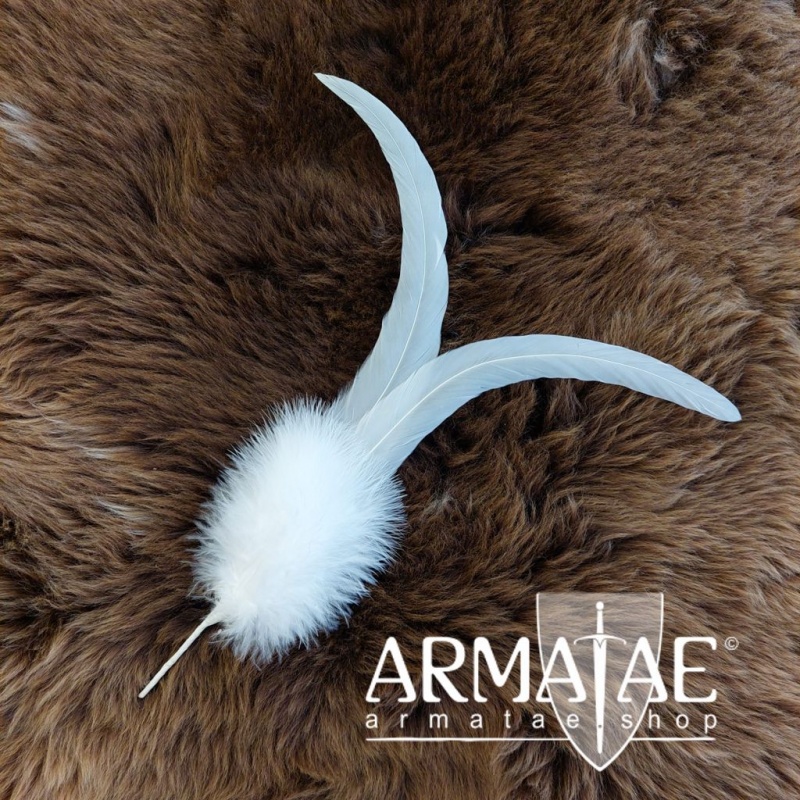 Eines der wohl weit verbreitetsten Schützenhut-Gestecke aus 2 weißen Hahnenfedern mit Flaum, fix & fertig gebunden.