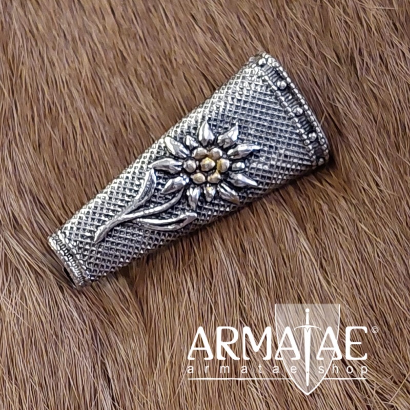 Diese Federhülse ist ca. 40 mm lang und 18 mm an der oberen Öffnung breit. Die Hülse ist eine Flachhülse, hat ein Edelweiß als Emblem, ist gemustert und besitzt auf der Hinterseite zum einfachen Befestigen am Hut oder Hutband eine Nadel mit Zuhaltehaken.