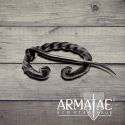 Diese Wikinger Fibel wurde aus einem 5 mm starkem Stahlrohling gefertigt, schön tordiert (gedreht) und weist zierlich aufgerollte Enden auf. Die 7,5 cm lange Nadel ist bedingt durch ihre leicht gekrümmte Form perfekt, um Umhänge, aber auch offene Gugel, Tuniken oder Kaftans usw. sicher verschließen zu können. Fibeln wurden vornehmlich unterhalb der rechten Schulter befestigt und waren ein fester Bestandteil der wikingerzeitlichen Tracht und gehören zu jeder authentischen Wikinger Gewandung einfach dazu, perfekt also für Reenactment aber auch LARP / Live Action Role Play.
