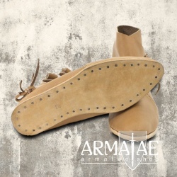 Hergestellt nach Funden in Jorvik und Haithabu präsentiert sich dieses frühmittelalterliche Schuhwerk aus der Zeit der Wikinger äußerst authentisch. Gegenüber des Originals sind diese Schuhe jedoch mit einer durchgenagelten harten Schuhsohle ausgestattet, welche den Schuh stabiler und langlebiger macht. Diese traditionelle Schustertechnik bewährt sich seit vielen Generationen.