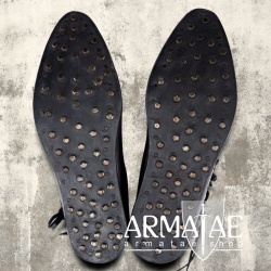 Hergestellt nach Funden in Jorvik und Haithabu präsentiert sich dieses frühmittelalterliche Schuhwerk aus der Zeit der Wikinger äußerst authentisch. Gegenüber dem Original sind diese Schuhe mit einer doppelten, durchgenagelten harten Schuhsohle und komplett benagelter Lauffläche ausgestattet, welche den Schuh viel stabiler, auf unbefestigten Wegen & Wiesen rutschfester, sowie weit langlebiger macht. Diese traditionelle Schustertechnik bewährt sich seit vielen Generationen. Ein Paar Schuhe, mit welchem du über viele Jahre deine Freude haben wirst.