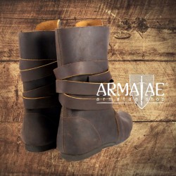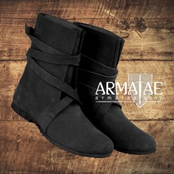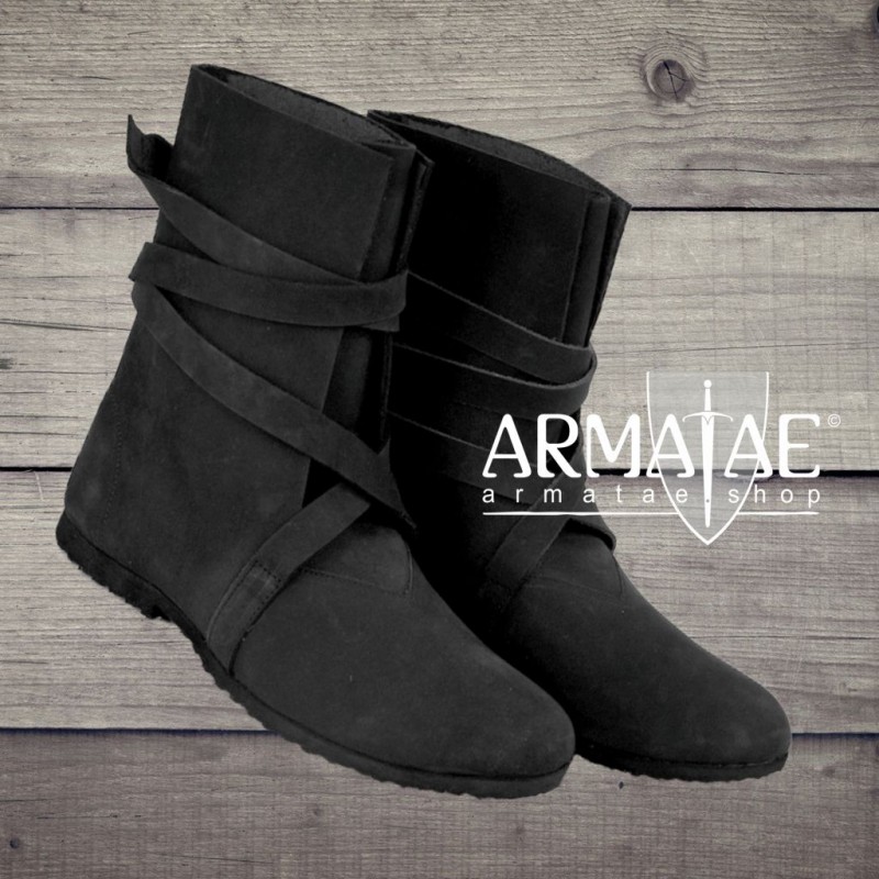 Ein hochwertiges Paar mittelalterliche Stiefel mit niedrigem Schaft, perfekt nicht nur für Wikinger, mit Frontlasche und über den Rist in Kreuz verlaufenden starken Lederriemen zum Verschnüren am Bein, gefertigt aus ca. 3 mm starkem und gewachsten Nubukleder. Diese Halbstiefel passen sich bedingt durch ihren Schnitt und der intelligenten Schnürung sehr gut an die Fußform an.