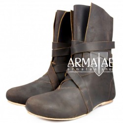 Sehr robuste halbhohe Haithabu Stiefel mit über den Rist verlaufender starker Schnürung für einen festen Halt, mit authentischer Ledersohle, gefertigt aus ca. 3 mm starkem, gewachstem Nubukleder.