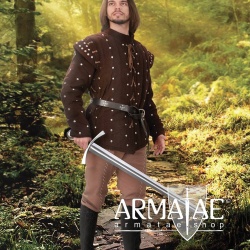 Dieser aufwendig, mit hunderten Nieten besetzte Gambeson-2-Teiler besteht aus einem Hemd mit gepolsterten Ärmeln, sowie einem ärmellosem Gambeson, ausgeführt wie ein typischer Wams mit betonenden Schultern.