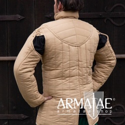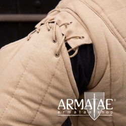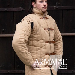 Dieser langärmlige Gambeson aus starkem Baumwollgewebe kommt vom LARP Ausstatter Epic Armoury ®, ist in Form und Art jedoch ziemlich authentisch, bietet allerdings nur bedingt Schutz. Die Wattierung besteht aus Polyester. Der Gambeson mit abnehmbaren Ärmeln ist wie ein Mantel anzuziehen und besitzt vorne 5 Lederriemen-Paare, jeweils doppelt vermietet, mit robusten Metallschnallen.