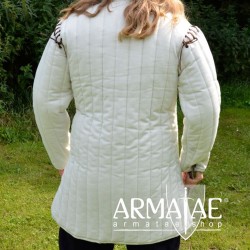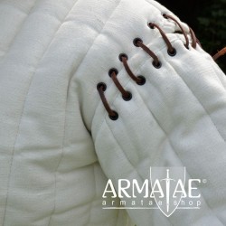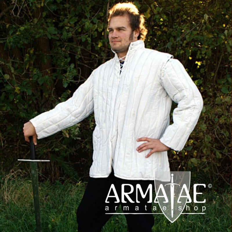 Hergestellt aus starkem Segeltuch aus 100 % Baumwolle mit Polyester-Polsterung. Bedingt durch die abnehmbaren Ärmel an den Achseln sehr gut belüftet. Der Gambeson ist durchwegs gut und fest abgesteppt, wodurch die Polsterung zwischen der Segeltuch Außen- und Innenseite sicher am Platz gehalten wird und nicht verrutscht.