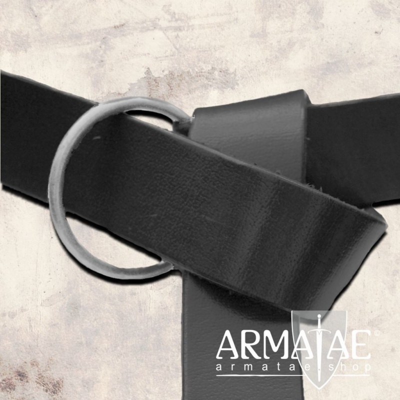 Ein schlichter, robuster, mittelalterlicher Ringgürtel. Bei der Knotentrageweise wird der Gürtel in den Ring geführt, dann von unten hinter dem Gürtel nach oben gezogen und wiederum durch die entstandene Lederschlaufe nach unten durchgezogen. So ist der Gürtel absolut passend justierbar, was bei modernen Gürteln mit Löchern in bestimmten Abständen nicht möglich ist.