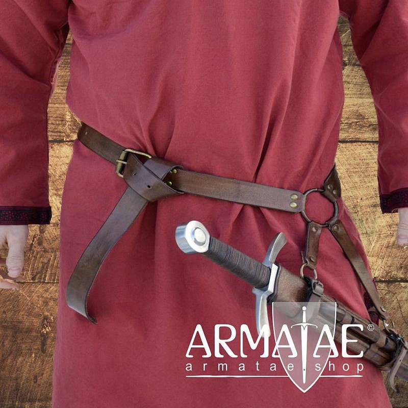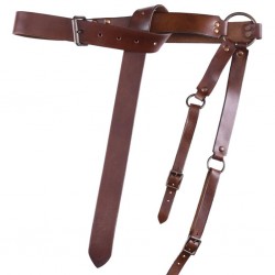 Sehr robust verarbeiteter mittelalterlicher Schwertgürtel aus Rindsleder, welcher zusätzlich zwei Riemen an einem massiven Stahlring aufweist, mit welchen man die Schwertscheide befestigt.