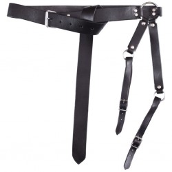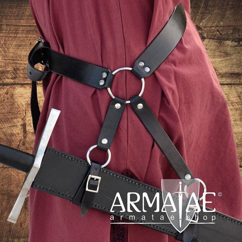 Sehr robust verarbeiteter mittelalterlicher Schwertgürtel aus Rindsleder, welcher zusätzlich zwei Riemen an einem massiven Stahlring aufweist, mit welchen man die Schwertscheide befestigt.