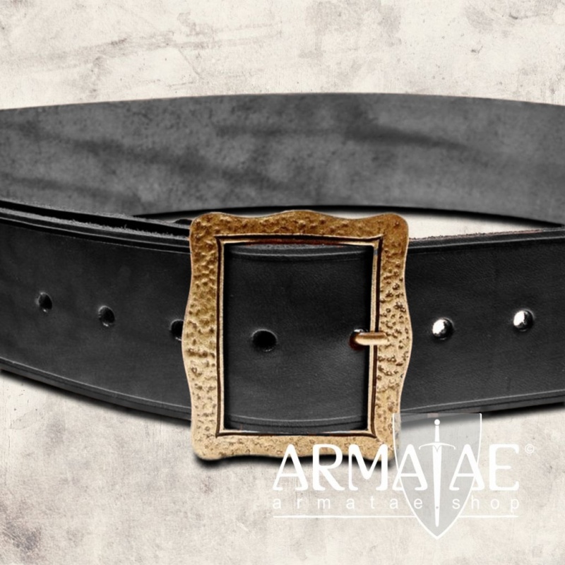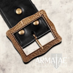 Gefertigt aus bestem Rindsleder, 3 - 3,5 mm stark und 5 cm breit, sowie mit einer Doppel-Gürtelschnalle aus massivem Guss, passt dieser Gürtel zu vielerlei historischen Gewandungen.