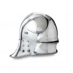 Äußerst originalgetreue Rekonstruktion eines deutschen Schallers des späten 15. Jahrhunderts, handgefertigt aus 1,6 mm Stahlblech. Ein sehr guter Schaukampfhelm, welcher für hohe Sicherheit sorgt. Das Visier wird im geschlossen Zustand durch einen Dorn fixiert.