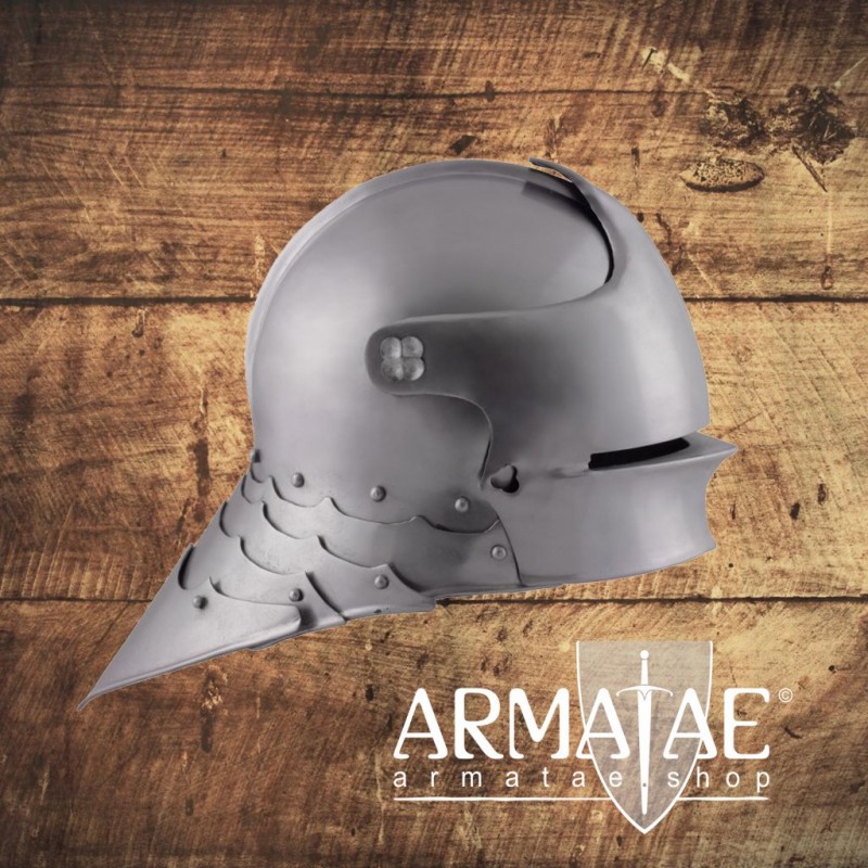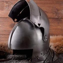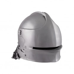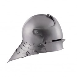 Sehr schön gelungene Replik eines deutschen Schallers aus 1,6 mm Stahlblech gefertigt, das Original ist auf ca. 1490 nach Christus datiert. Die an den Helm genieteten Nackenlamellen sind beweglich. Deutsche Schaller (auch Schallern genannt) werden für gewöhnlich zusammen mit einer Halsberge getragen.