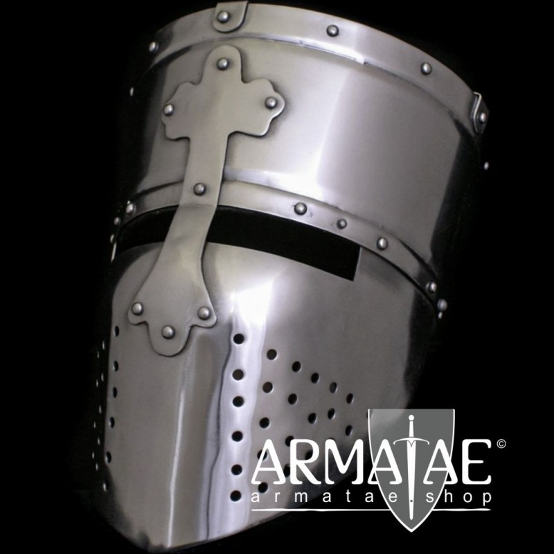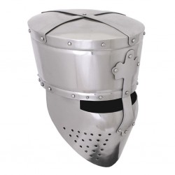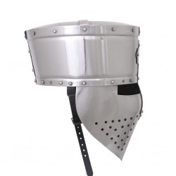 Aus 1,6 mm starkem Stahlblech gefertigte Replik eines Kreuzfahrer Helmes, Topfhelmes mit Gesichtsplatte. Solche Helme kamen Ende des 12. Jahrhunderts auf und wurden vornehmlich von Kreuzrittern, Templern getragen, eine sehr gelungene, robuste und authentische Replik.