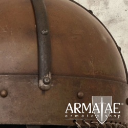 Der Helm ist bewusst nicht auf Hochglanz poliert, sondern hat eine künstlich gealterte Oberfläche, welche seine Authentizität unterstreicht. Er besitzt eine eingenietete, sehr hochwertige sowie verstellbare Kopf Polsterung nebst robustem Kinnriemen aus Leder und Messingschnalle.