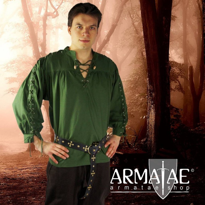 Dieses markant maskuline Mittelalter-Hemd besitzt vorne und an den Ärmeln bis hin zum Stehkragen durch Metallösen verlaufende Schnürungen. Ein Hemd für den Kämpfer, den überlegenen Helden, ideal für LARP, Live-Action-Role-Play, Cosplay und hochwertige Kostümierungen für Theaterbühne, Film & Fernsehen, oder einfach für den Karneval, bzw. Fasching, wenn man eine hochwertige Kostümierung sucht.