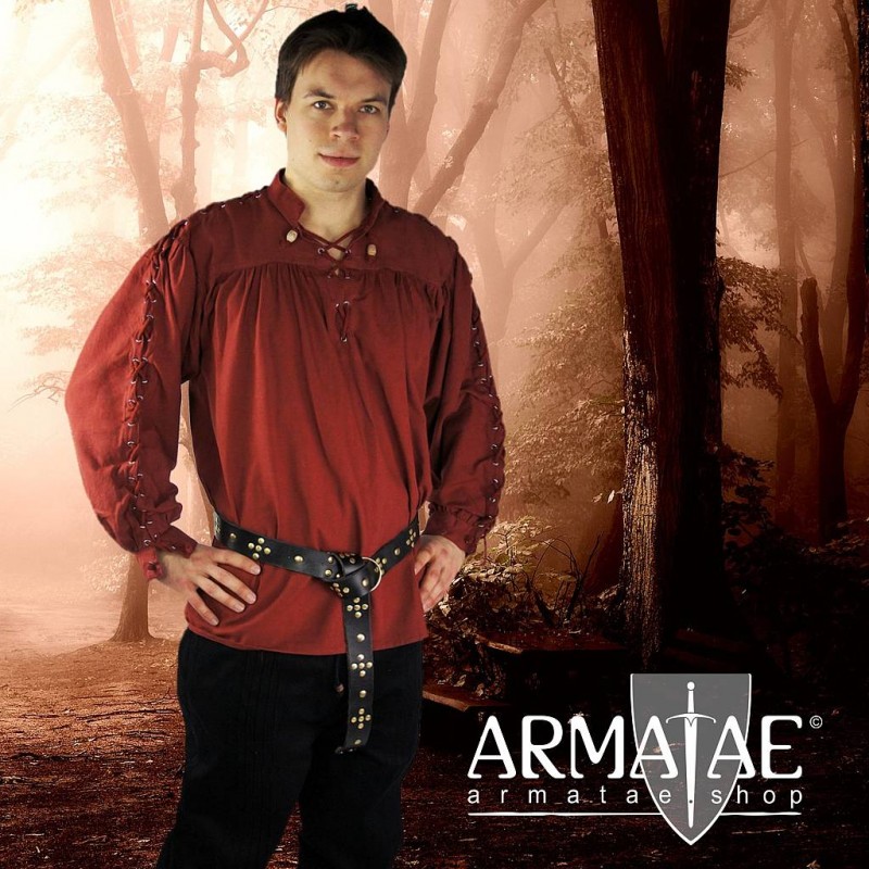 Dieses markant maskuline Mittelalter-Hemd besitzt vorne und an den Ärmeln bis hin zum Stehkragen durch Metallösen verlaufende Schnürungen. Ein Hemd für den Kämpfer, den überlegenen Helden, ideal für LARP, Live-Action-Role-Play, Cosplay und hochwertige Kostümierungen für Theaterbühne, Film & Fernsehen, oder einfach für den Karneval, bzw. Fasching, wenn man eine hochwertige Kostümierung sucht.