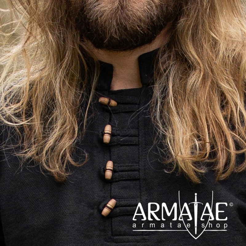 Wunderbar weiches, robustes Hemd mit unaufdringlichem Schnitt aus dicker handgewebter Baumwolle, mit sehr schöner Struktur, Stehkragen und markanter Knopfleiste mit 4 länglichen Knöpfen aus Hartholz.
