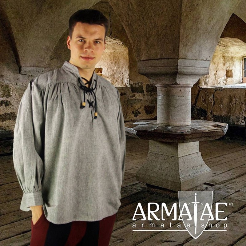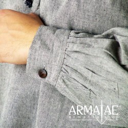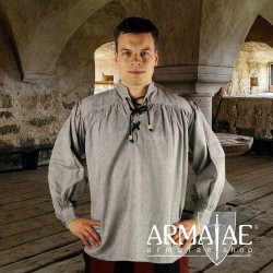 Ein schweres, stark gereichtes Hemd in ausgezeichneter Qualität aus grober Baumwolle mit dezentem Stehkragen und starkem Kordelzug am Dekolleté in umnähten Knopflöchern. Der markante Schnitt betont Schultern und Arme und zusammen mit dem groben Baumwollgewebe unterstreicht es gekonnt die Männlichkeit des Trägers und vermittelt wahre Kraft.