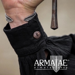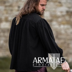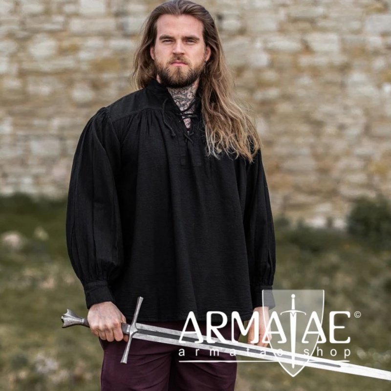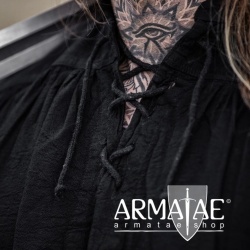 Typisches mittelalterliches Herrenhemd, stark gereicht, mit Stehkragen und Schnürung am Dekolleté sowie klassisch weitem Schnitt.