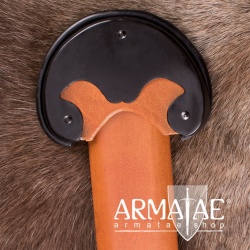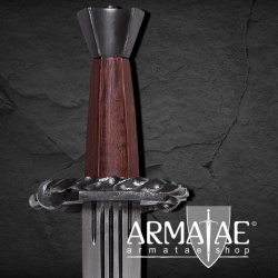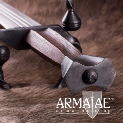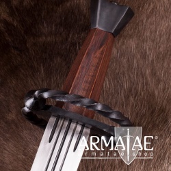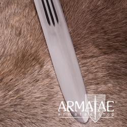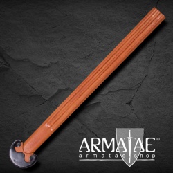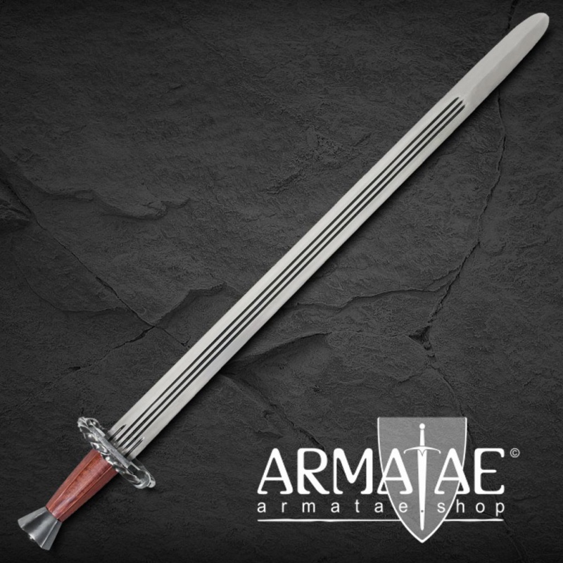 Die Spitze ist abgerundet und die Schlagkante beträgt 2 mm. Das Schwert ist somit für leichten, schnellen Schaukampf geeignet. Die Klinge hat insgesamt drei Hohlkehlen. Sowohl der Holzgriff und als auch der Stahlknauf und der geschmiedete Handschutz sind sehr solide verarbeitet. Im Lieferumfang ist eine mit Leder umwickelte Holzscheide inklusive.