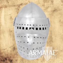 Ein sehr beleibter Helm des Mittelalters in authentischer Form und schaukampftauglicher Ausführung. Der Helm besitzt auch die für diese Zeit typischen Messingapplikationen, um eine Kettenbrünne (separat erhältlich) daran zu befestigen.