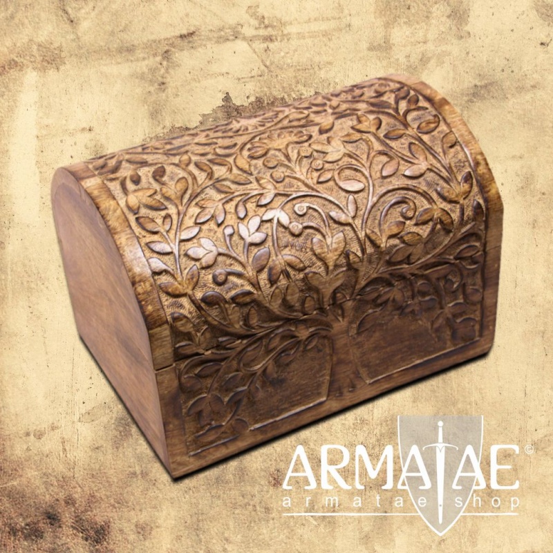 Kunstvoll von Hand geschnitzte Truhe aus Holz mit einer Größe von ca. L 24 x B 15,5 x H 16 cm. Sehr dekorativ, mit typischem Klappdeckel.