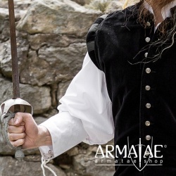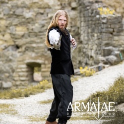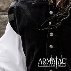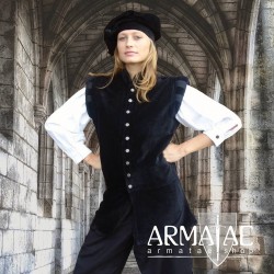 Aus reinem Baumwollsamt aufwendig gefertigter Wams mit klassischen Schulterwülsten farblich abgesetzt gestreift und rund verlaufendem Stehkragen. Der figurbetonte Schnitt mit den breit ausgeführten Schultern und den markanten Knöpfen aus Metall macht diesen Wams zu einem wahren Hingucker. Ein Highlight auf jedem Mittelaltermarkt, Mittelalterfest, auf der Theaterbühne oder in Film- und Fernsehproduktionen.