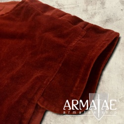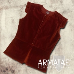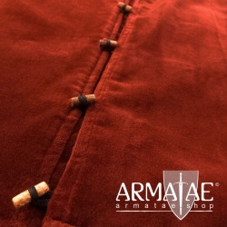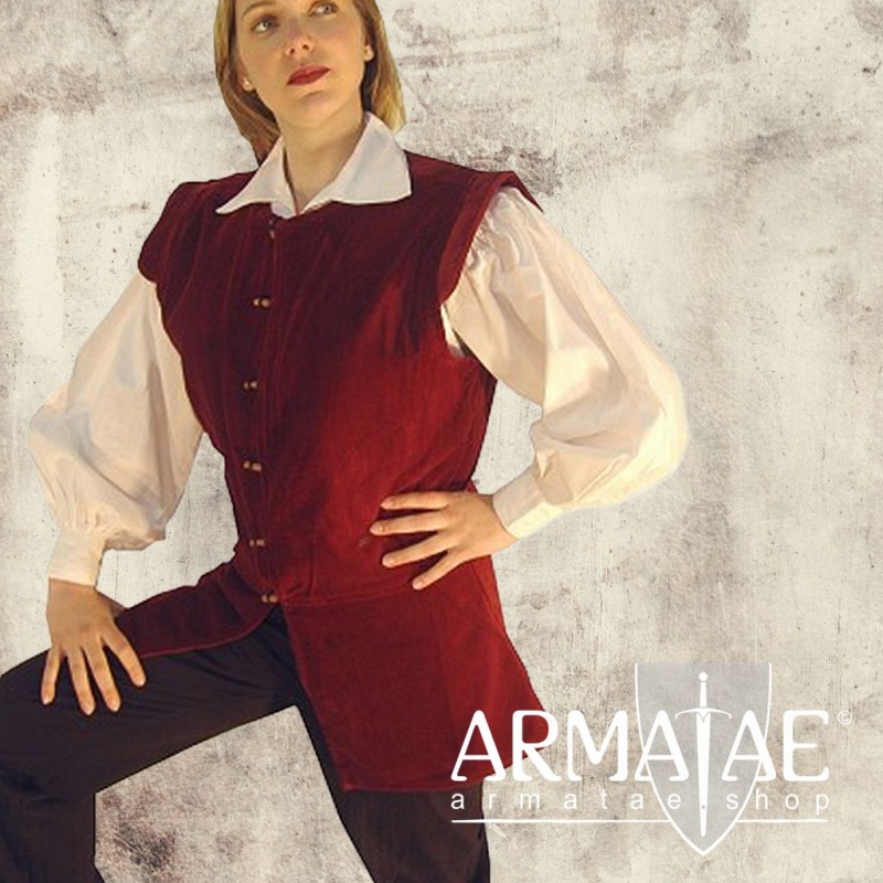 Markanter Schnitt, gefertigt aus echtem Baumwollsamt mit Baumwoll-Innenfutter. Mit rundem Halsausschnitt und breit ausgestellten Schultern sowie Knopfleiste mit 6 Holzknebel ein sehr gelungener Wams, welcher zugeknöpft den Oberkörper perfekt betont, aber auch offen getragen eine gute Figur macht.