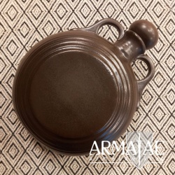 Eine schöne Feldflasche mit Keramik-Korkstoppel und zwei kunstvoll angesetzten Ringen für ein Lederband oder einen dünnen Strick, damit man sich die Flasche, wie es sich gehört, umhängen kann. Die flache Form stört am Körper nicht, rollt nicht und dank Standboden kann die Flasche auch hingestellt werden.