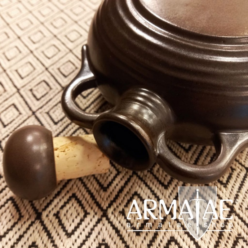 Eine sehr robuste, bei 1.120 °Celsius gebrannte Ware aus dunklem Ton, glasiert in der Farbe Toledo, welche je nach Brand und Auftrag zwischen Anthrazit und Dunkelbraun alterniert, wobei zudem auch der Lichteinfall die Farbe leicht variieren lässt. Angenehm griffige Haptik.