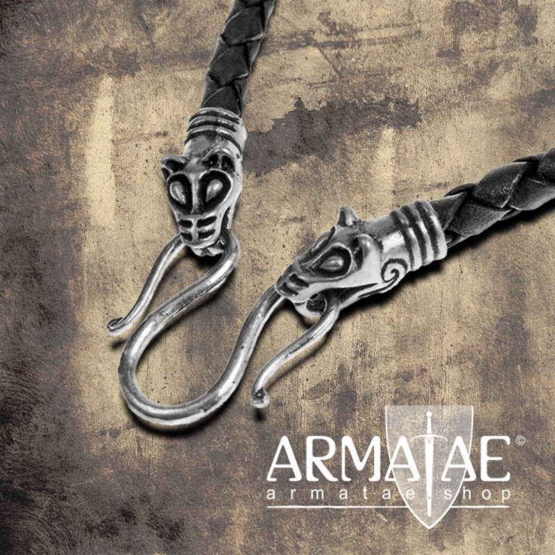 Die den Abschluss der Halskette bildenden Wolfsköpfe sind mit einem in den Mäulern eingesetzten Schmuckhaken verbunden. Sehr schön ist auch der stilvolle Verschluss mit seiner filigranen Flechtband-Ornamentik. Um einen Anhänger an der Wikinger-Lederkette zu befestigen, einfach den die beiden Mäuler verbindenden Omega-Haken aufbiegen und dann einen beliebigen Anhänger einhängen, sofern dessen Öse mehr als DM 4 mm misst.