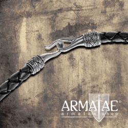 Das historische Vorbild für die Endkappen war der berühmte Wolfskreuz-Thorshammer von Fossi auf Island, der auf das 10. Jahrhundert datiert wurde. Die geflochtene Lederkordel ist in zeitlosem matt-schwarz mit versilberten Endkappen oder einem schönen antik-braun mit Abschlüssen aus hochwertiger Schmuckbronze poliert erhältlich.