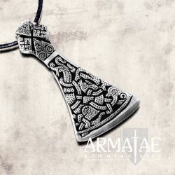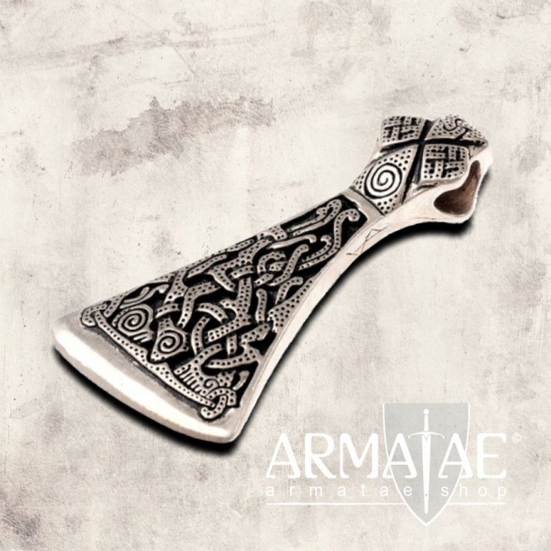 Der Anhänger Mammen-Axt hat die Maße 4,9 x 2,6 cm und zeichnet sich durch die filigrane, detailreich ausgearbeitete Oberfläche aus.