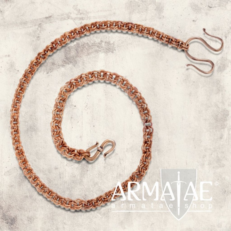 Die Wikinger-Fibelkette wird aus hochwertiger Schmuckbronze in mühevoller Handarbeit aus einzelnen Ringen gefertigt. Der Durchmesser der einzelnen Kettenringe liegt bei 5,5 mm bei einer Stärke von 1 mm. Die Kette selbst misst 33 cm Länge. Inklusive der Haken misst die Wikinger-Kette 37,5 cm und ist damit lang genug, um von einer Brosche von der Brust hängend bis zur Taille zu reichen.
