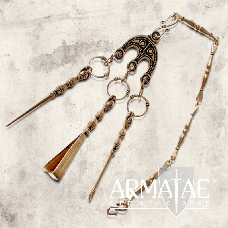 Ohrlöffel, Pinzette und Pfriem an diesem wikingerzeitliche Hygiene-Besteck wurden nach historischen Funden von der schwedischen Insel Gotland gefertigt, die auf das 9. bis 10. Jahrhundert datieren, der Kettenverteiler stammt hingegen von der Insel Öland.