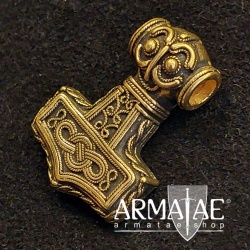Diese Replik des Mjölnirs von Ödeshög folgt eng dem historischen Original, allerdings ist die Nachbildung nicht mit aufgesetzten Granalien versehen, sondern in einem Stück hohl gegossen, wobei bedingt durch die hochwertige Schmuckbronze die filigrane Gestaltung sehr gut zum Ausdruck kommt.