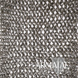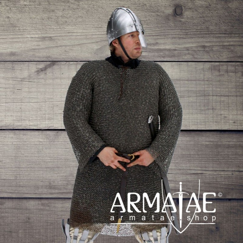 Hochwertiges Kettenhemd, ein sogenanntes Hauberk, welches in etwa bis zum Knie reicht und lange Ärmel besitzt, per Hand hergestellt in 4 in 1 Flechtung, durchwegs aus mit Rundkopfnieten vernieteten Rundringen ID 8 mm mit 1,5 mm Stärke.