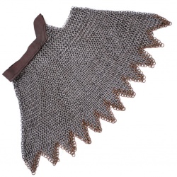Kettenbrünnen wurden vornehmlich bei Nasalhelmen und spätmittelalterlichen Beckenhauben und Hundsgugel verwendet, um den Schulter- und Nackenbereich Schutz zu bieten. Die Brünne weist einen gezackten Rand auf und hat zur Befestigung am Helm einen starken Lederriemen aufgenäht, ungelocht, damit die Montage kundenseitig exakt passend zum Helm erstellt werden kann.