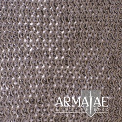 Die Kettenbrünne besteht aus einem 4 in 1 Geflecht-Mix, 4 vernietete ID 8 mm Flachstahlringe fügen sich an einen gestanzten, geschlossen ID 8 mm Flachstahlring an und umgekehrt, die Ringbreite beträgt ca. 1,6 mm. Diese Art Kettengefecht ist weniger aufwendig als voll vernietetes Kettenzeug, da hier nur jeder 2. Ring vernietet werden muss. Ein klassisch europäisches Flachringgeflecht, welches in verschiedenen Abwandlungen bereits in der Antike und bis ins Spätmittelalter Anwendung fand.