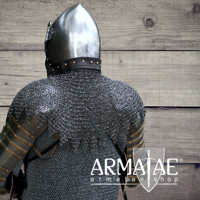 Kettenbrünnen wurden vornehmlich bei Nasalhelmen und spätmittelalterlichen Beckenhauben und Hundsgugel verwendet, um den Schulter- und Nackenbereich Schutz zu bieten. Die Brünne weist einen gezackten Rand auf und hat zur Befestigung am Helm einen starken Lederriemen aufgenäht, ungelocht, damit die Montage kundenseitig exakt passend zum Helm erstellt werden kann.