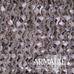 Das Hauberk besteht aus reinem 4 in 1 Geflecht aus mit Rundkopfnieten vernieteten ID 8 mm Flachstahlringen, die Flachringbreite beträgt ca. 1,8 mm. Dieses rein in Handarbeit gefertigte Kettengefecht ist sehr dicht, stabil und äußerst aufwendig in der Herstellung. Gegenüber einem Flachring-MIX ideal bei Reparaturen, oder individuellen Anpassungen betreffend Körpergröße usw., da jeder Ring einzeln gelöst werden kann, was bei einem Mix mit 50 % Anteil an gestanzten, geschlossenen Flachstahlringen natürlich nicht möglich ist.